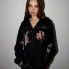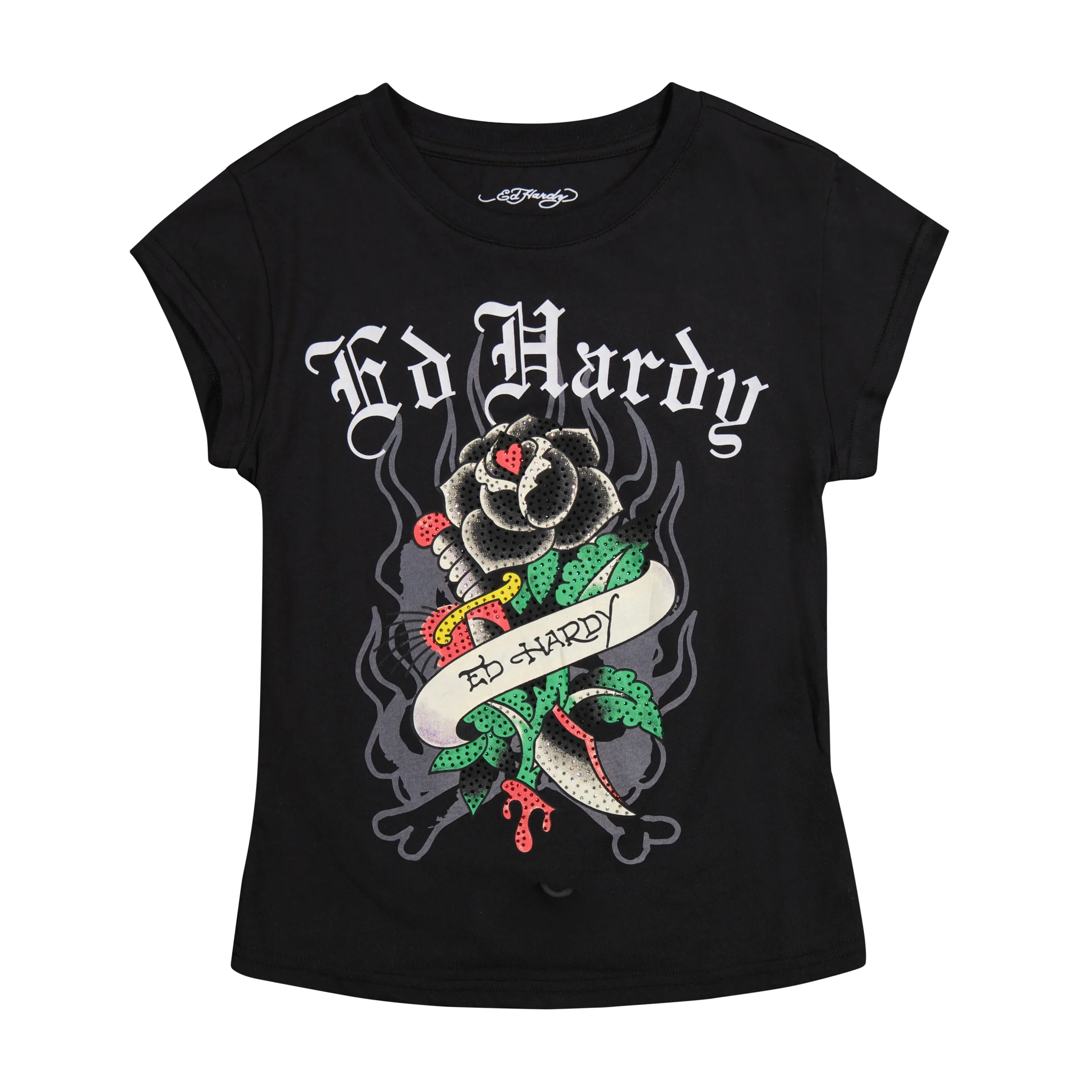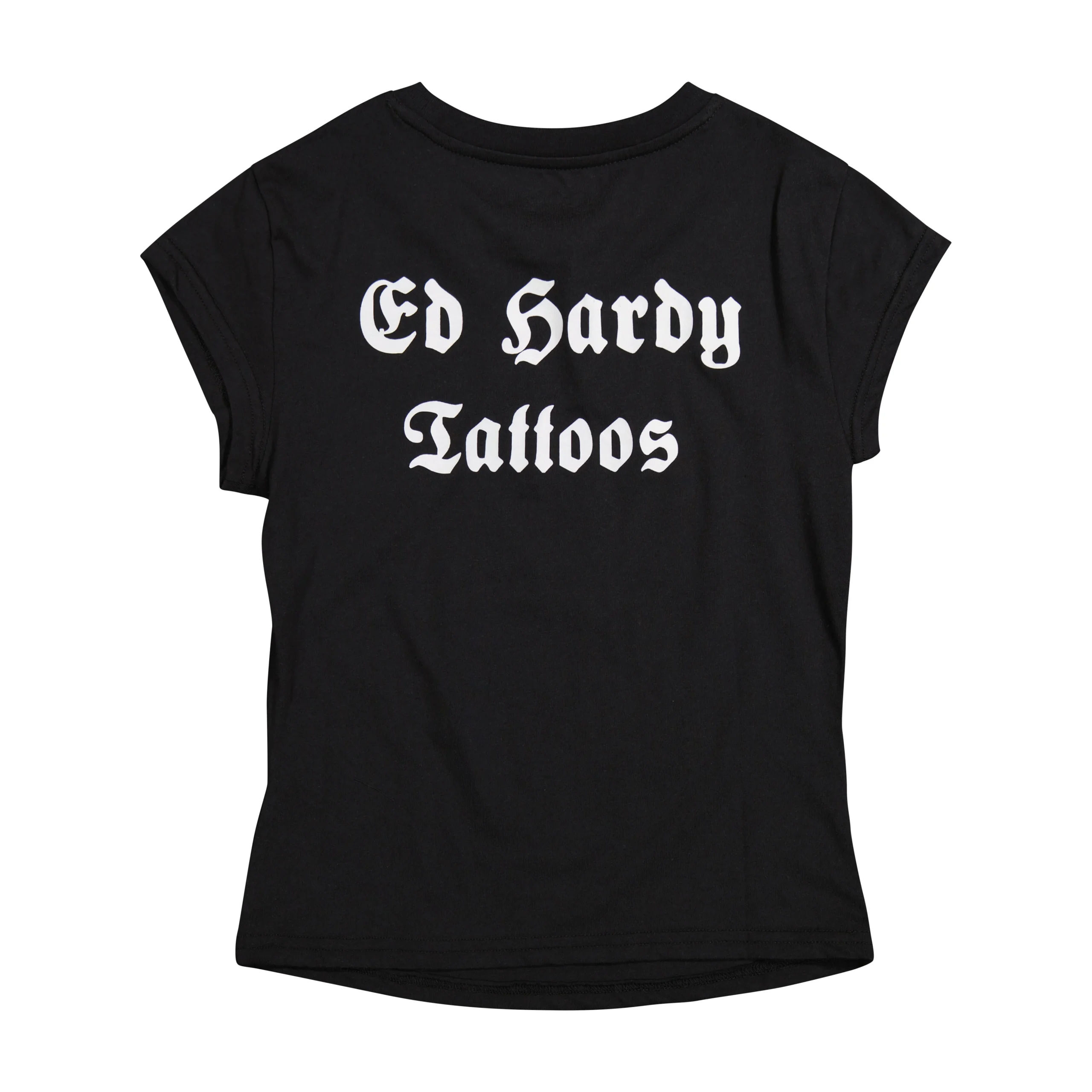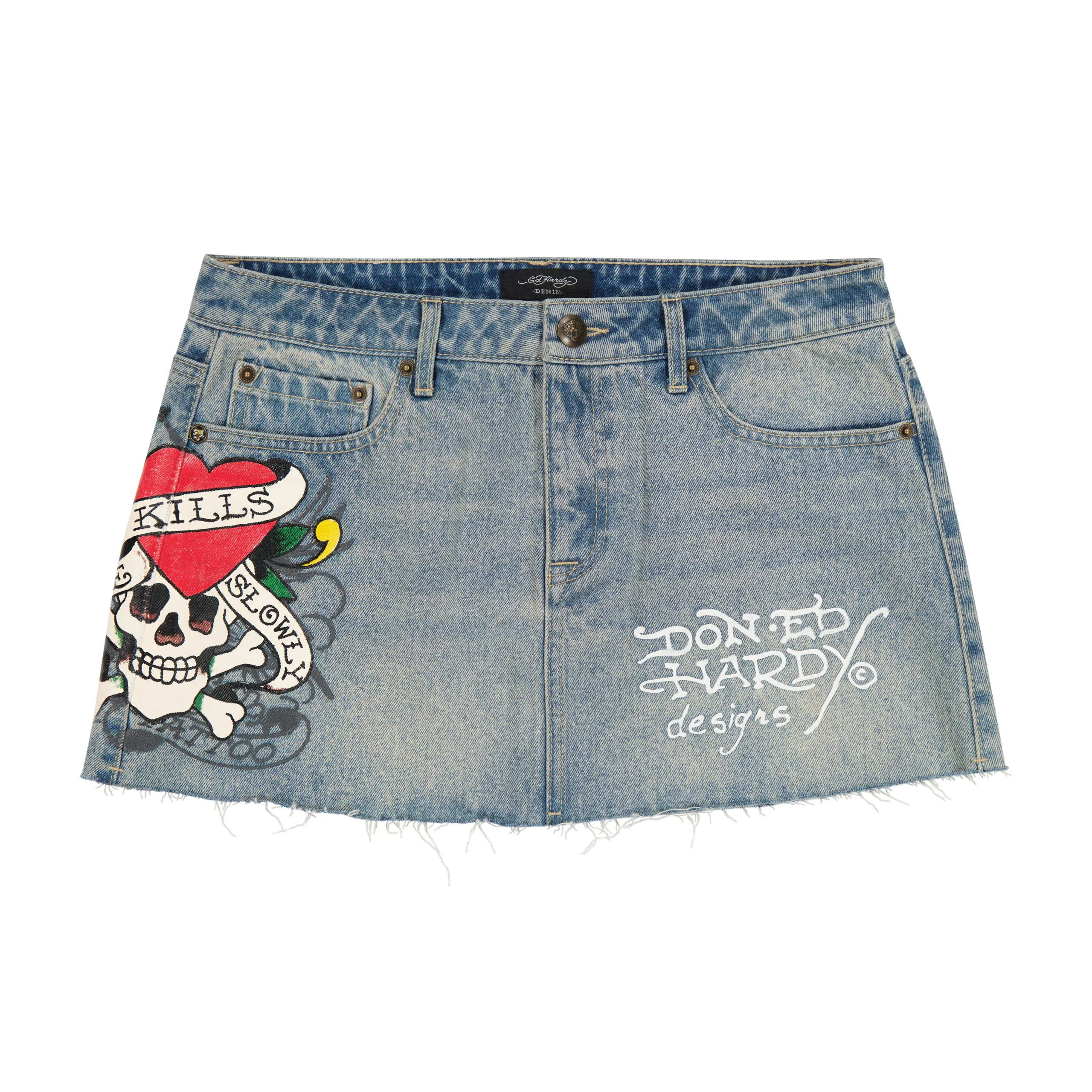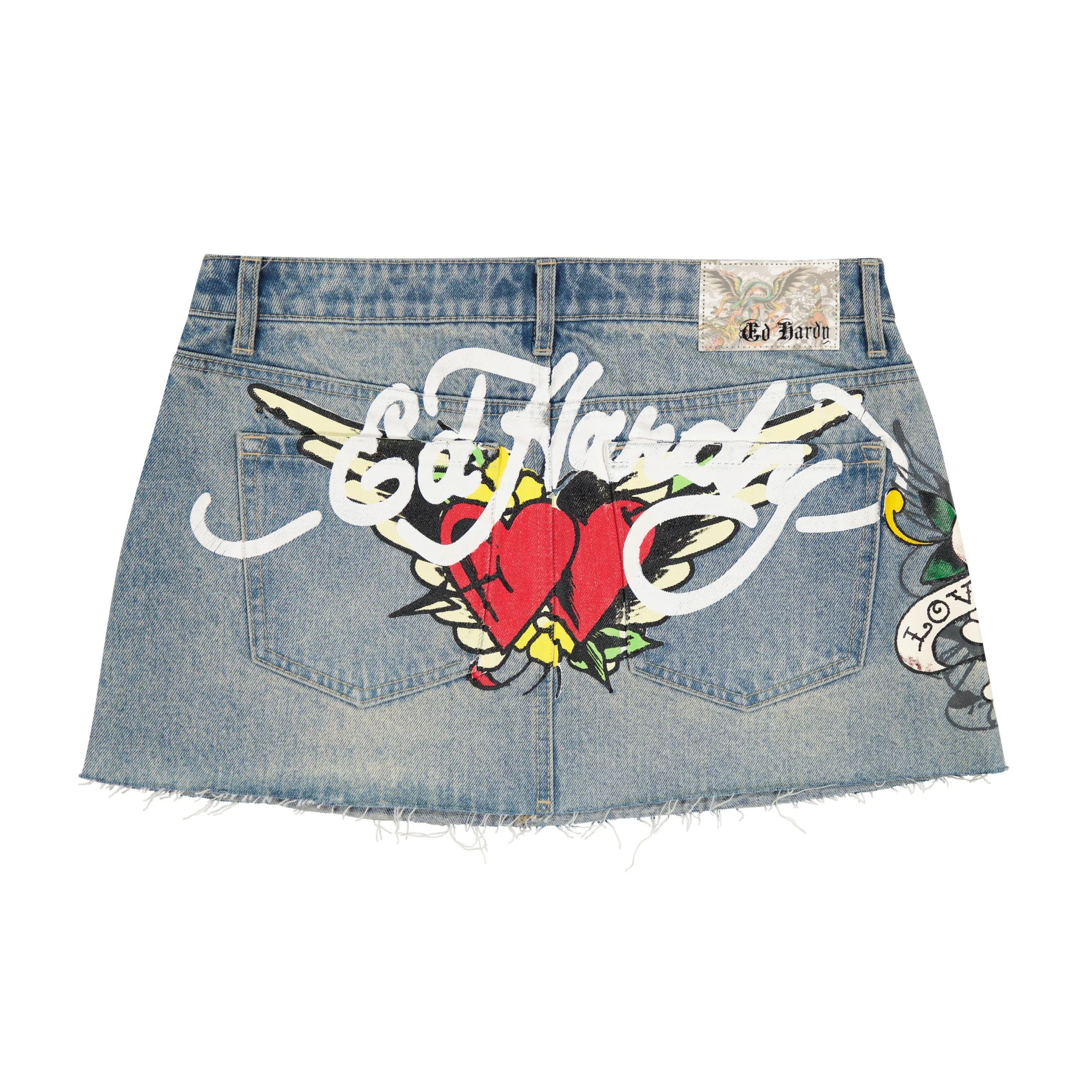 These fleece mini shorts feature an archival dagger girl graphic, complete with an Ed Hardy by Kim Petras rainbow foil logo.