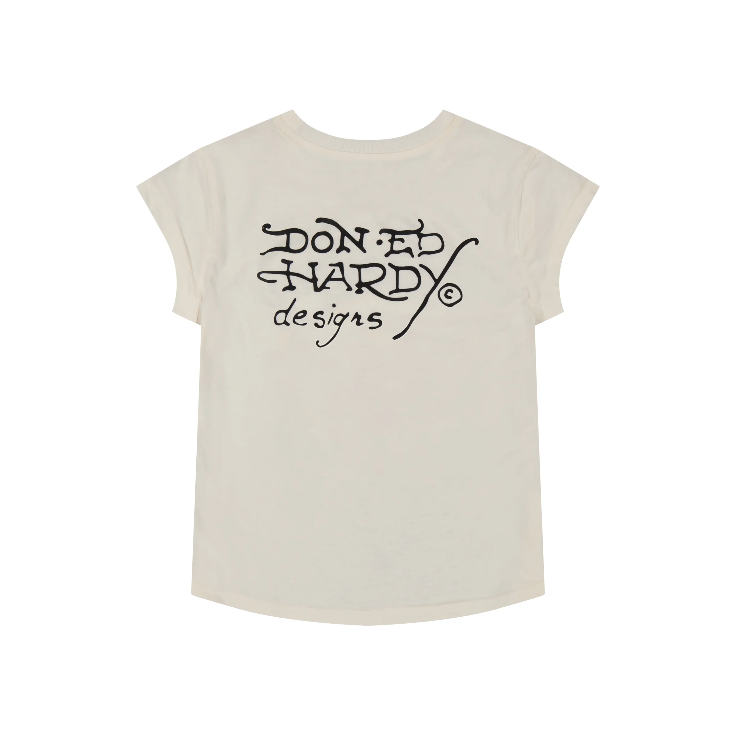 Cap sleeve fitted tee cropped at the waist and cut from a cotton poly blend in black. Complete with archival logos and a rhinestone adorned Fire Tiger graphic.