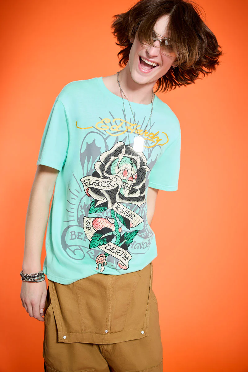 This heavyweight fleece hoodie features an Ed Hardy logo and a Motley Crue “Dr. Feel Good” graphic.
