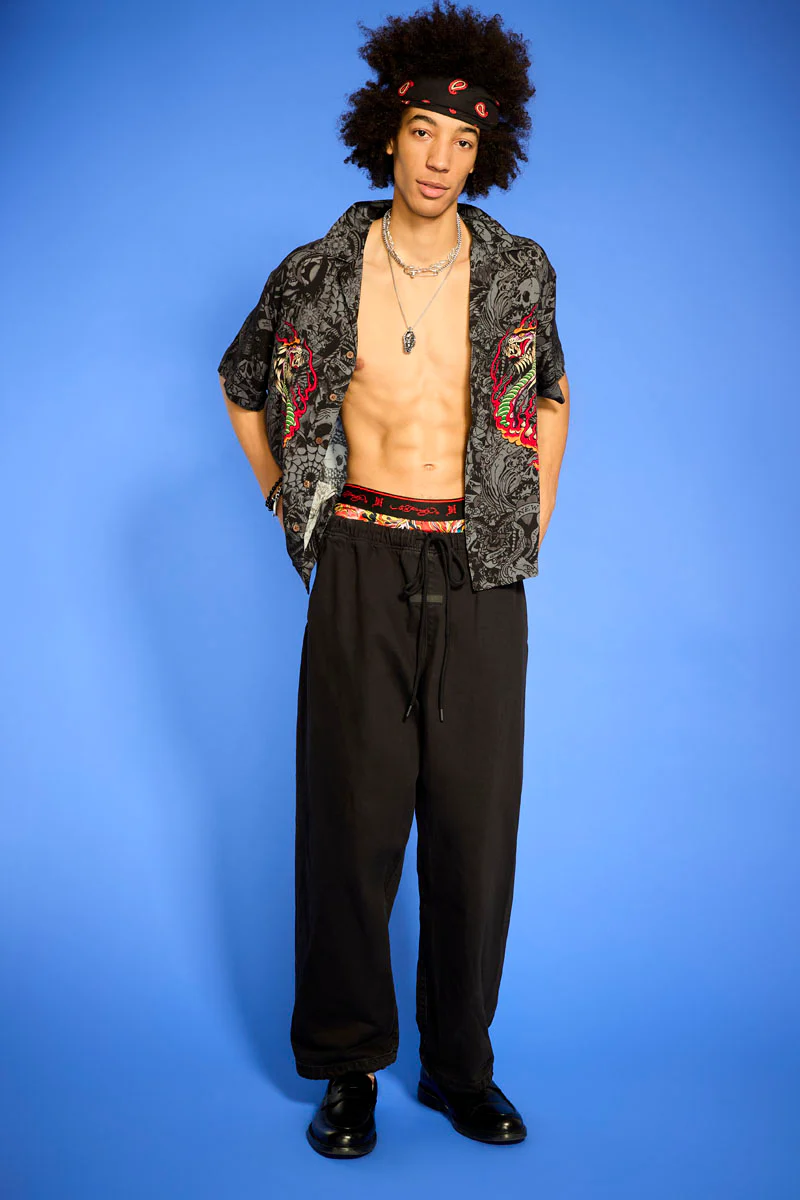This Slim fit tapered jean by Ed Hardy features rip accents and classic graphic print detailing throughout. Mid-rise jeans in a classic cotton denim fabrication. Fitted with pockets and a zip fly with button closure.