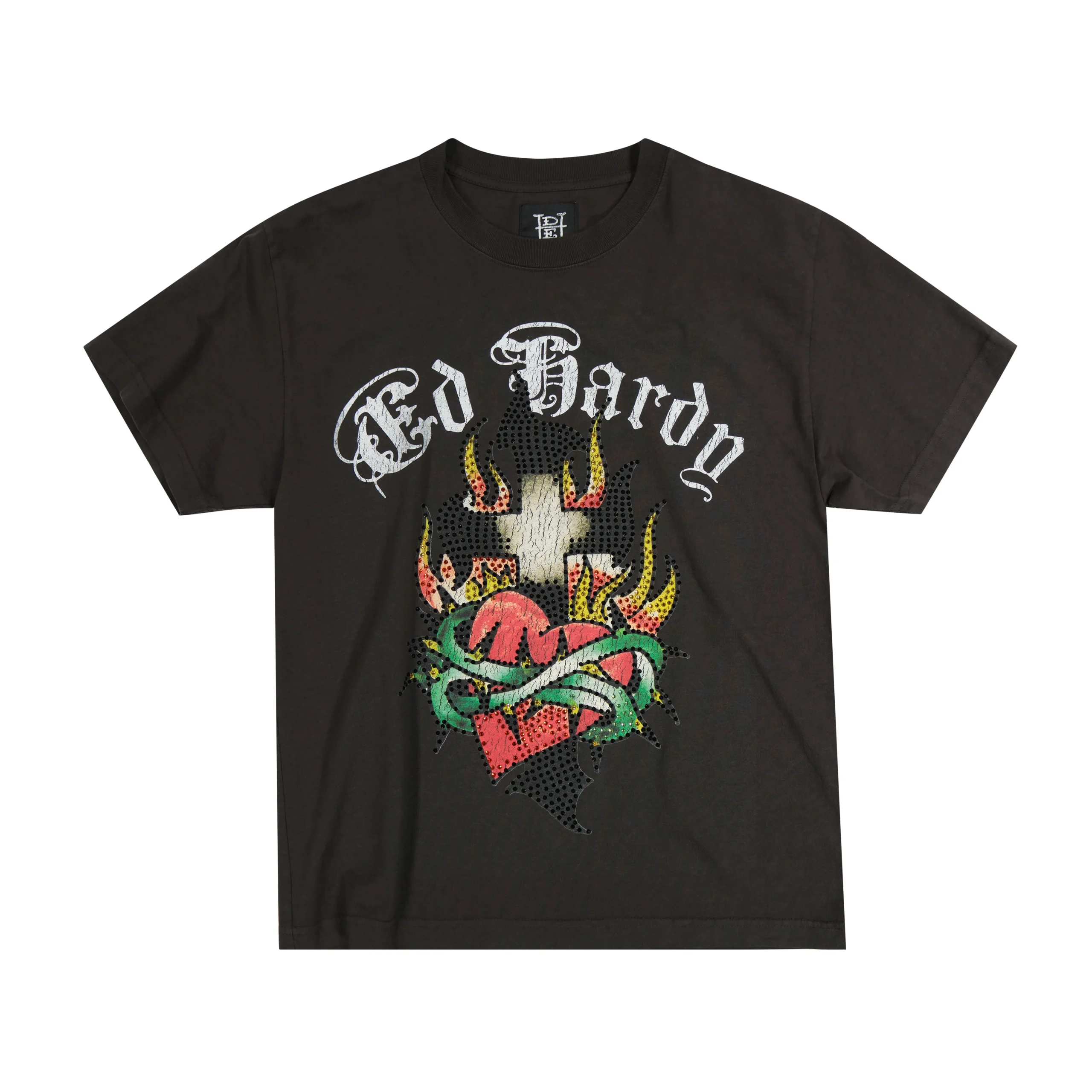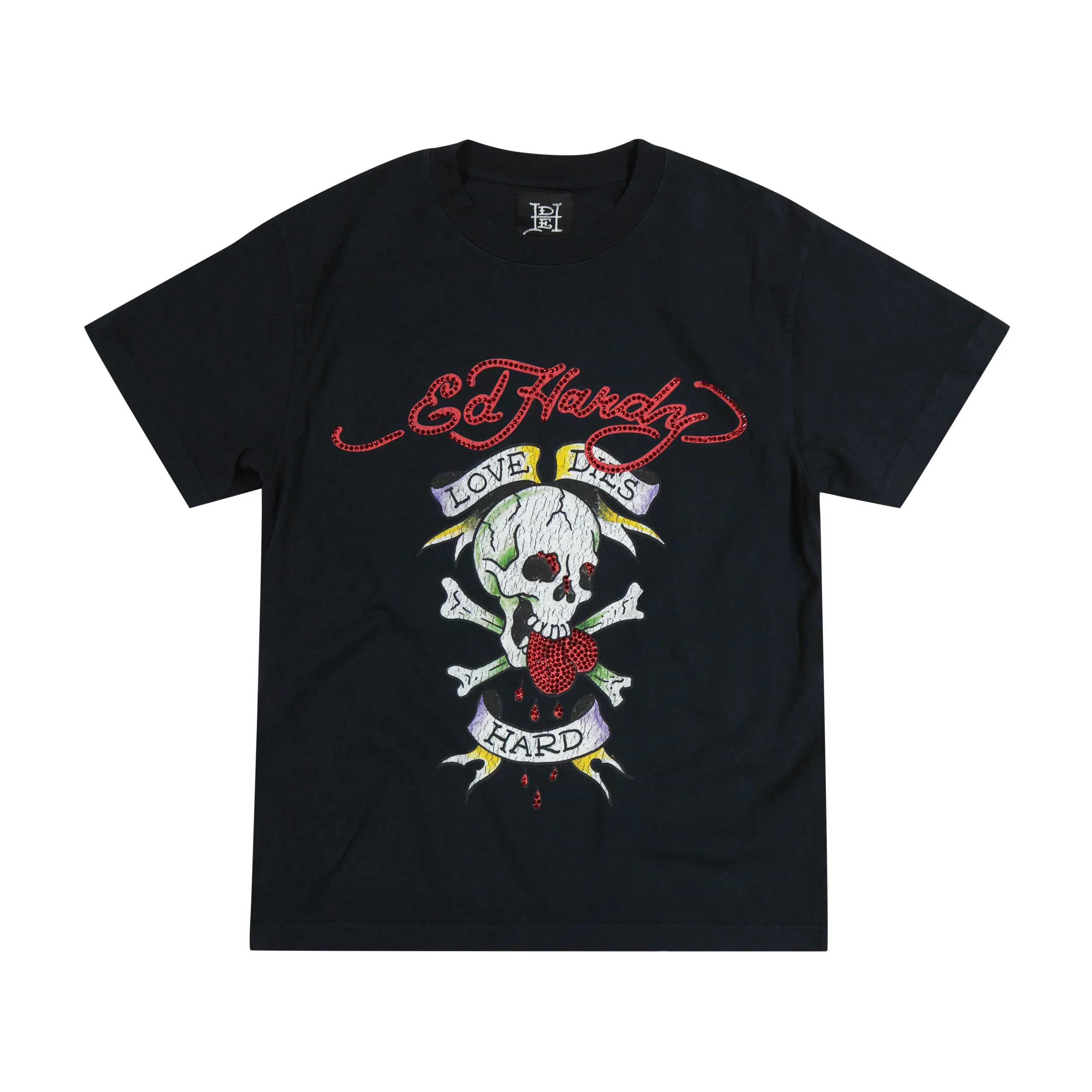 Limited edition luxury tee crafted from 100% heavy weight cotton. Treated with a garment wash to ensure the perfect faded vintage feel. Complete with archival Ed Hardy artwork and embellished with royal blue rhinestones.