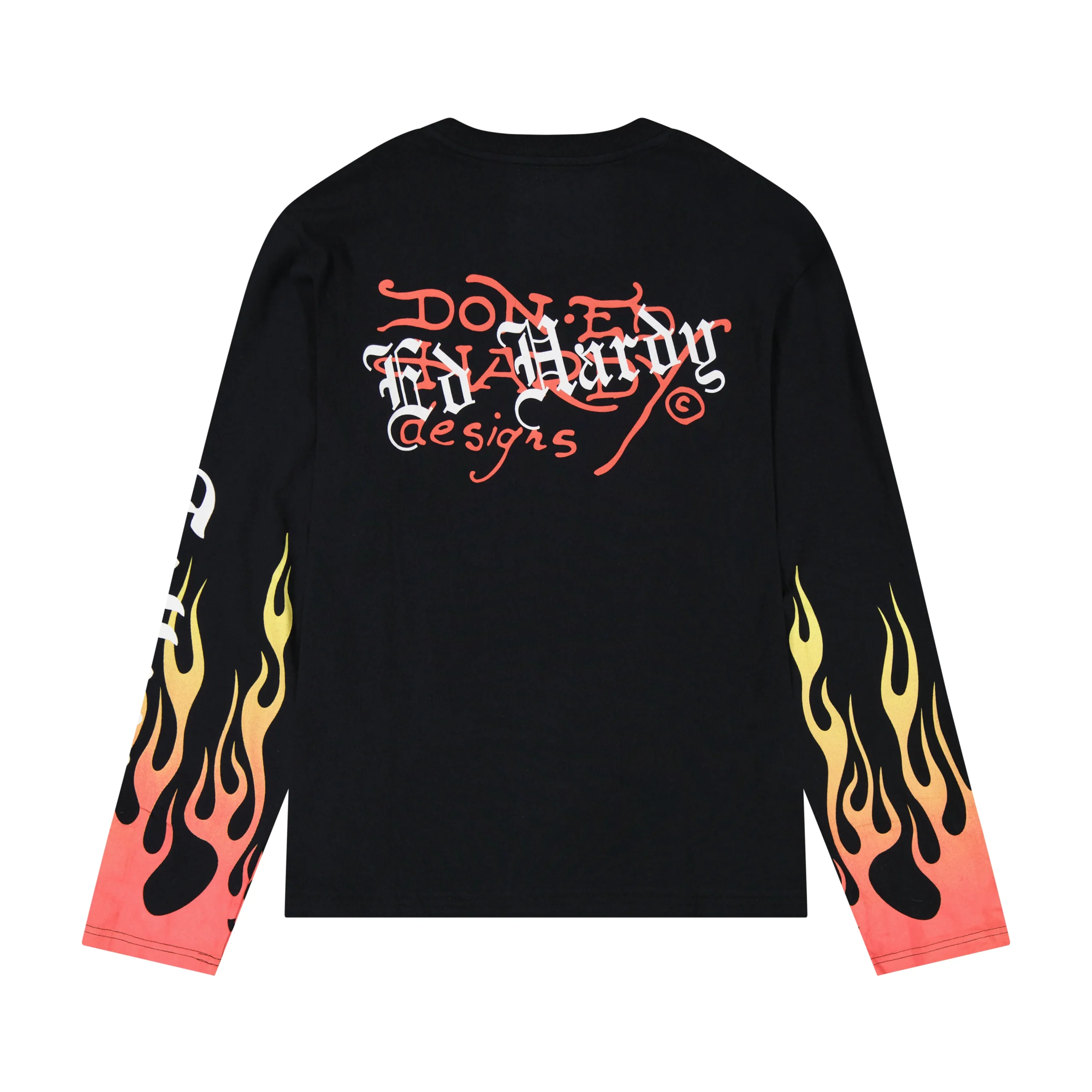 This long sleeve tee is cut from 100% cotton in the color black. Features multiple archival Dragon graphics and complete with layered Ed Hardy logos.