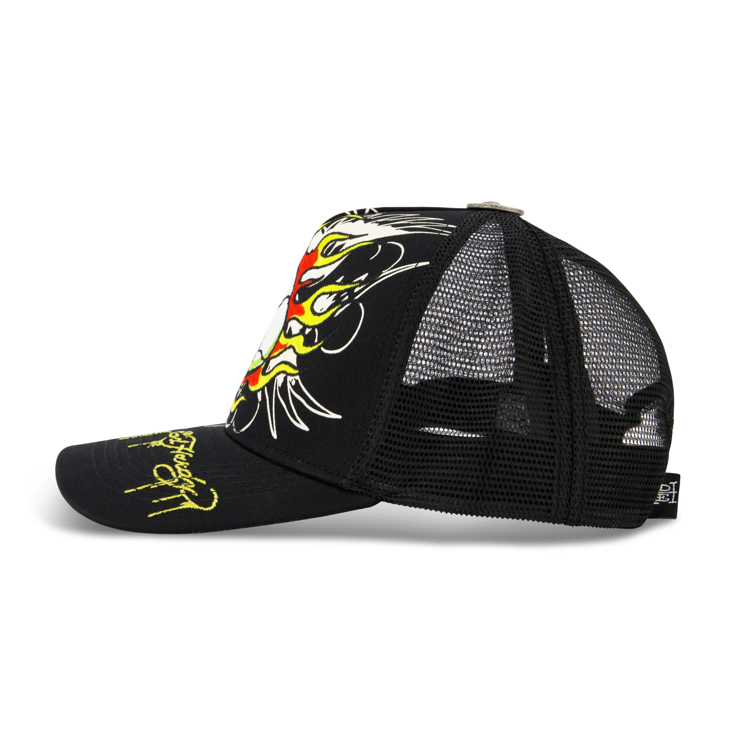 This throwback Ed Hardy trucker features a signature embroidered eagle snake. Complete with a mesh snap back and curved brim.