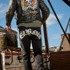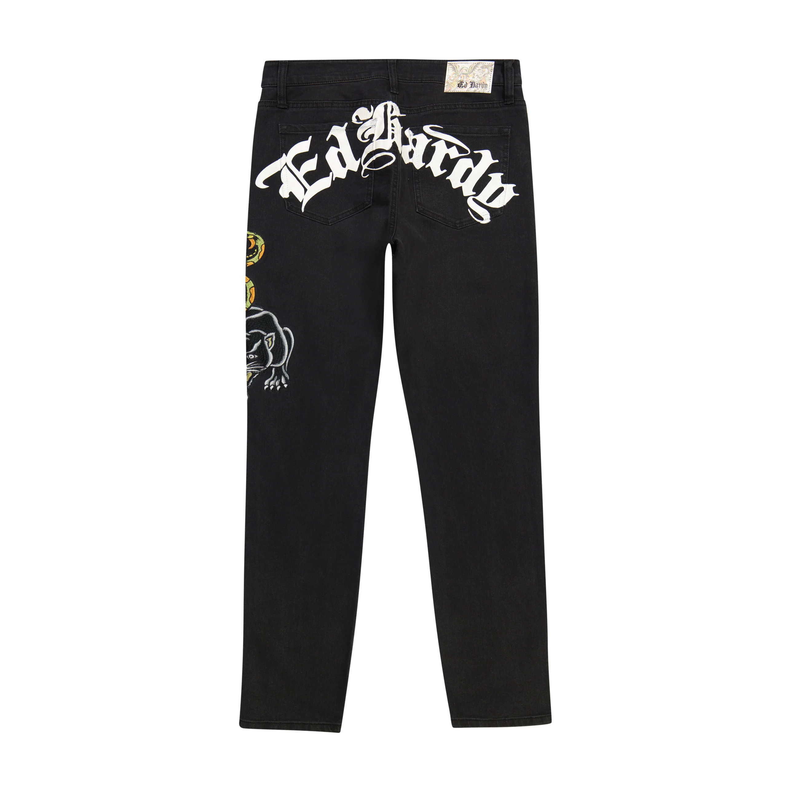 Embrace Y2K fashion nostalgia with Ed Hardy Denim. These black jeans feature a slim tapered silhouette, classic cotton fabrication, and a dagger skull graphic.