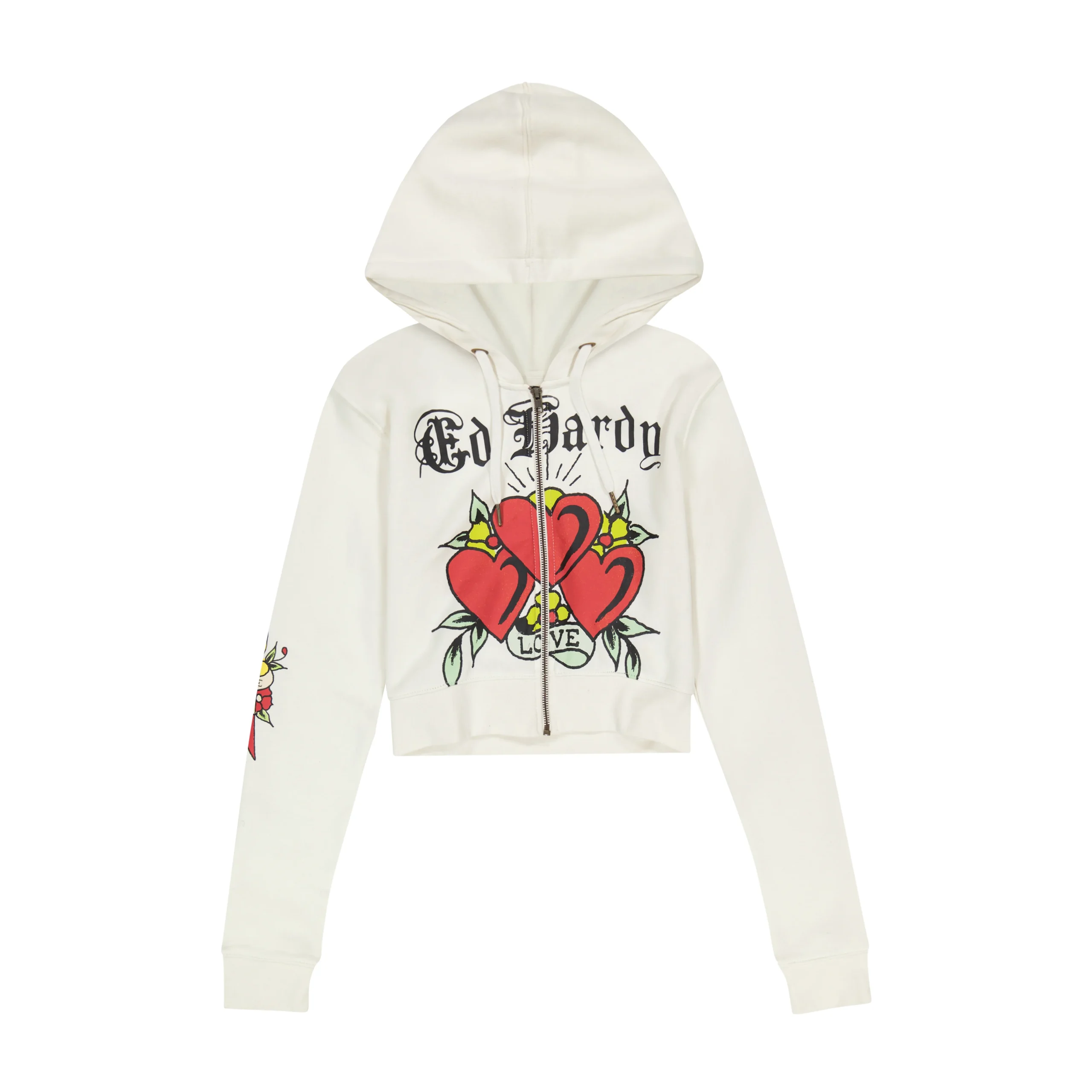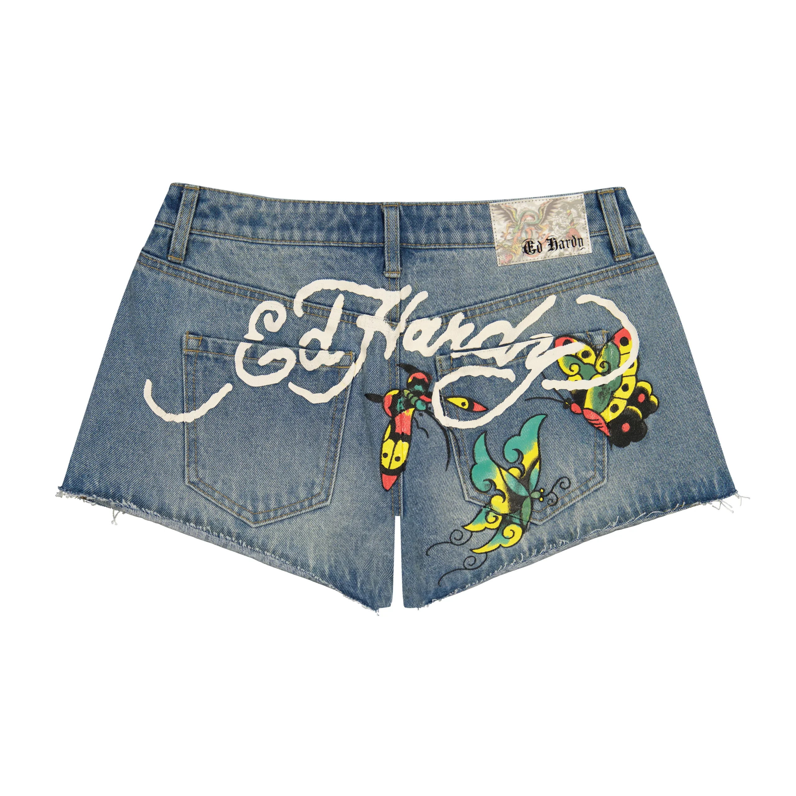 This Y2K inspired mini skirt is constructed from a light wash stretch denim. Features cargo pockets and white Ed Hardy logos, complete with an archival heart dagger graphic.
