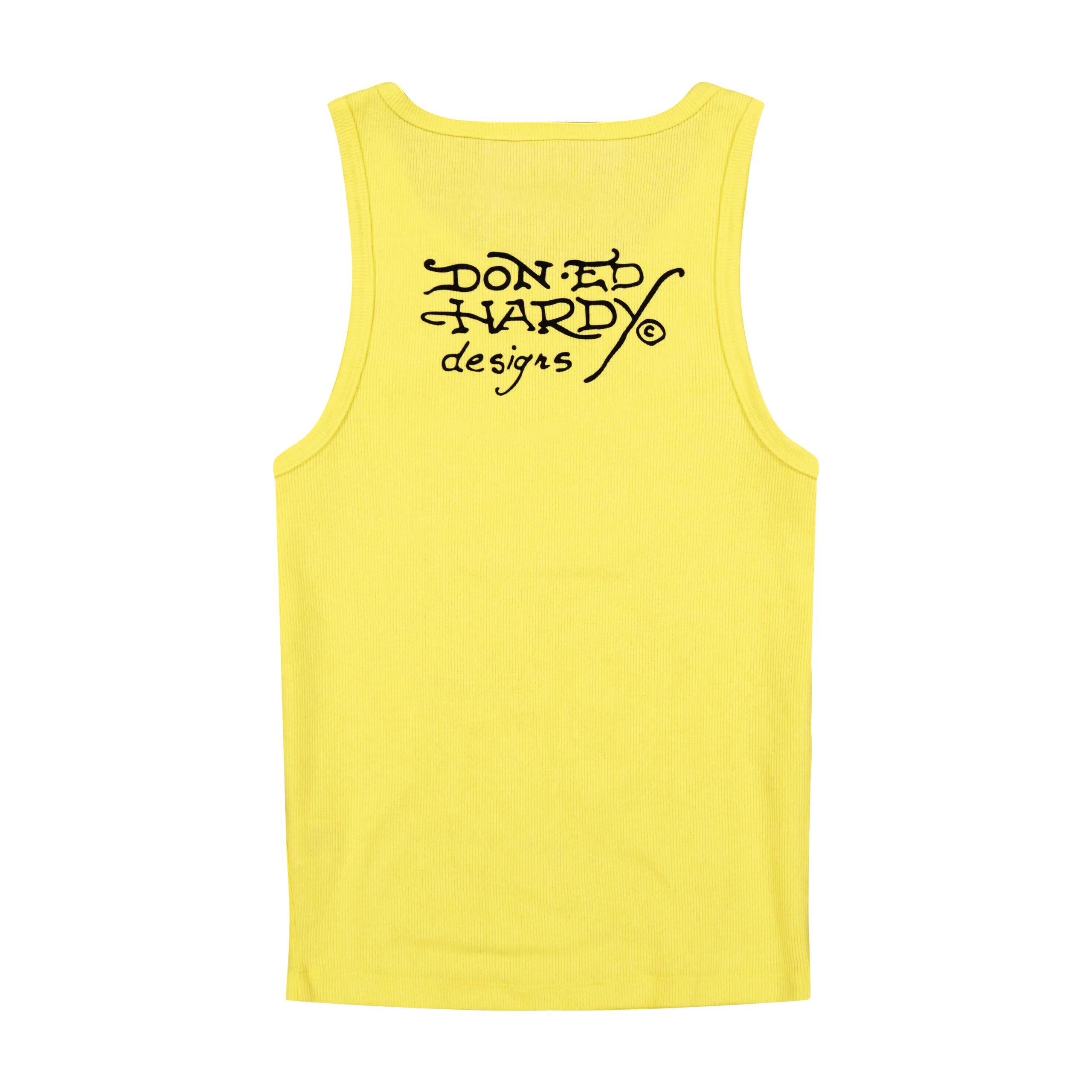 Slim fit tank top cut from a rib knit in white and adorned with rhinestones. Features a signature Ed Hardy heart sword graphic and multiple archival logos.