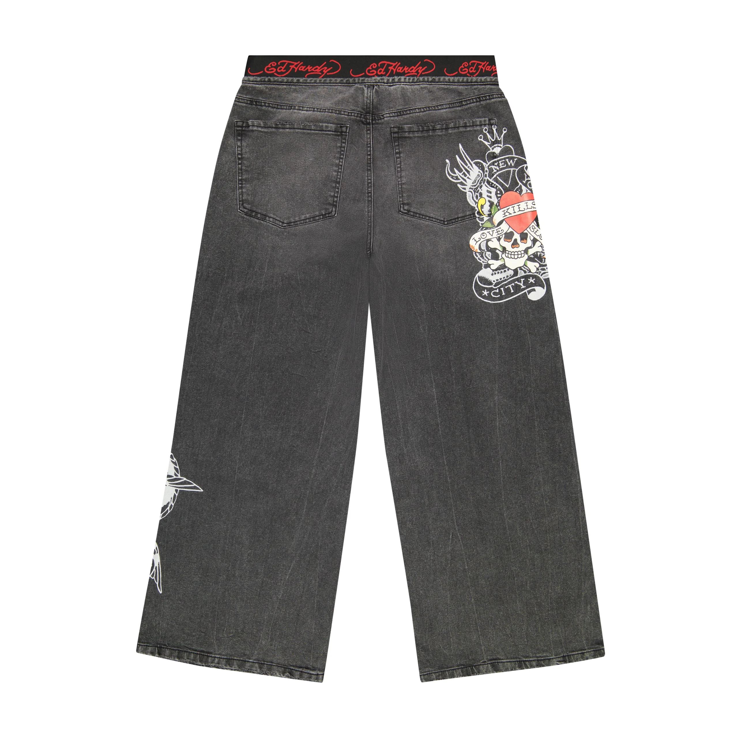 These wide leg vintage grey jeans feature an elastic waist band and a baggy fit. Complete with a custom gun metal skull zipper pull and archival Ed Hardy art.