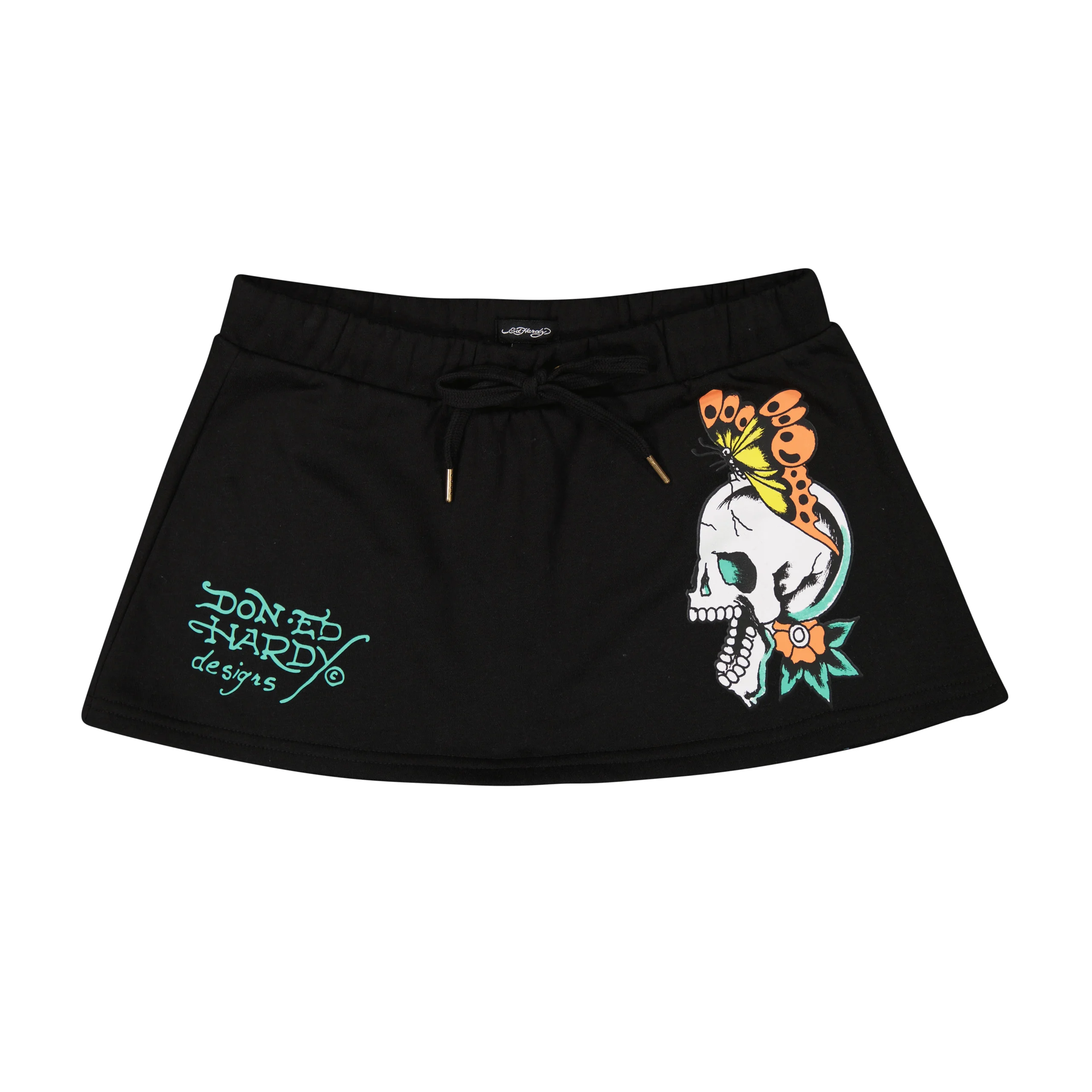 This Mae X Ed Hardy Showgirl skirt is made with luxury faux leather featuring a pink custom printed inside lining and Mae’s signature beaded logo chain along back V cut out.